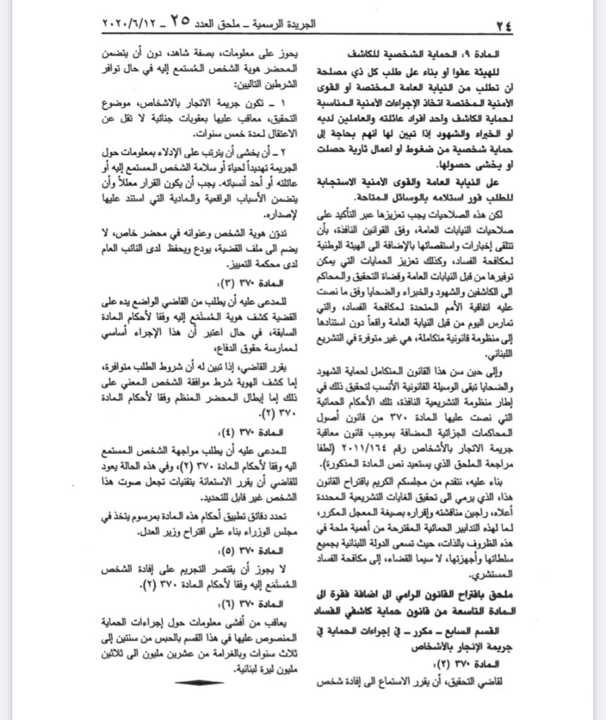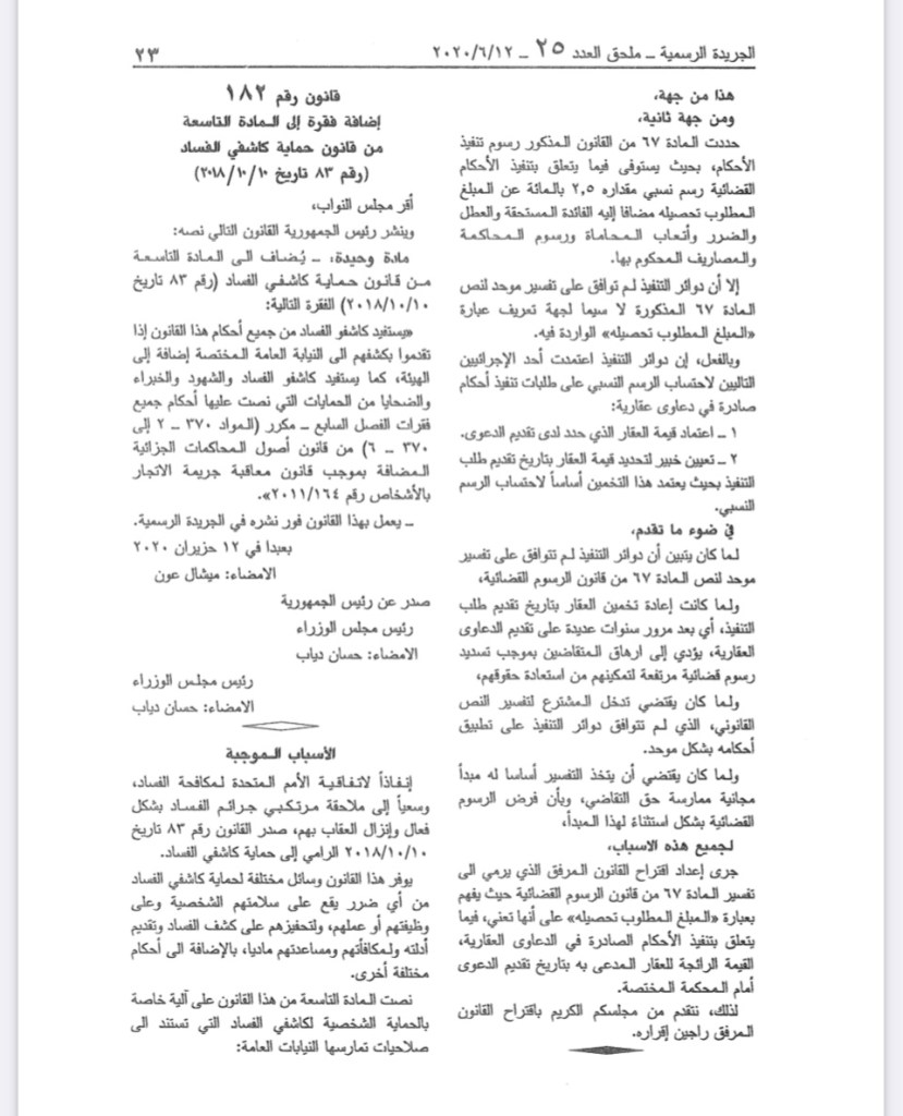 القانون رقم 182 – 2020 اضافة فقرة الى المادة التاسعة من قانون حماية كاشفي الفساد